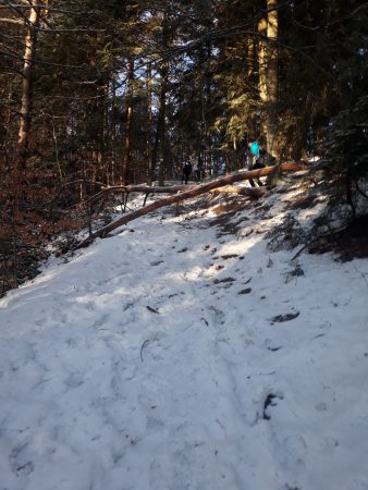 Do punktu na Słowiku jeszcze 11km. Podbiegi coraz bardziej dają się we znaki. Jest bardzo ślisko! Pod cienką warstwą śniegu na całej szerokości szlaku kryje się lód. Zakładam raczki. Ale ulga! Cisnę nie przejmując się zdradzieckim podłożem. Co chwila widzę miejsca wywrotek moich poprzedników.